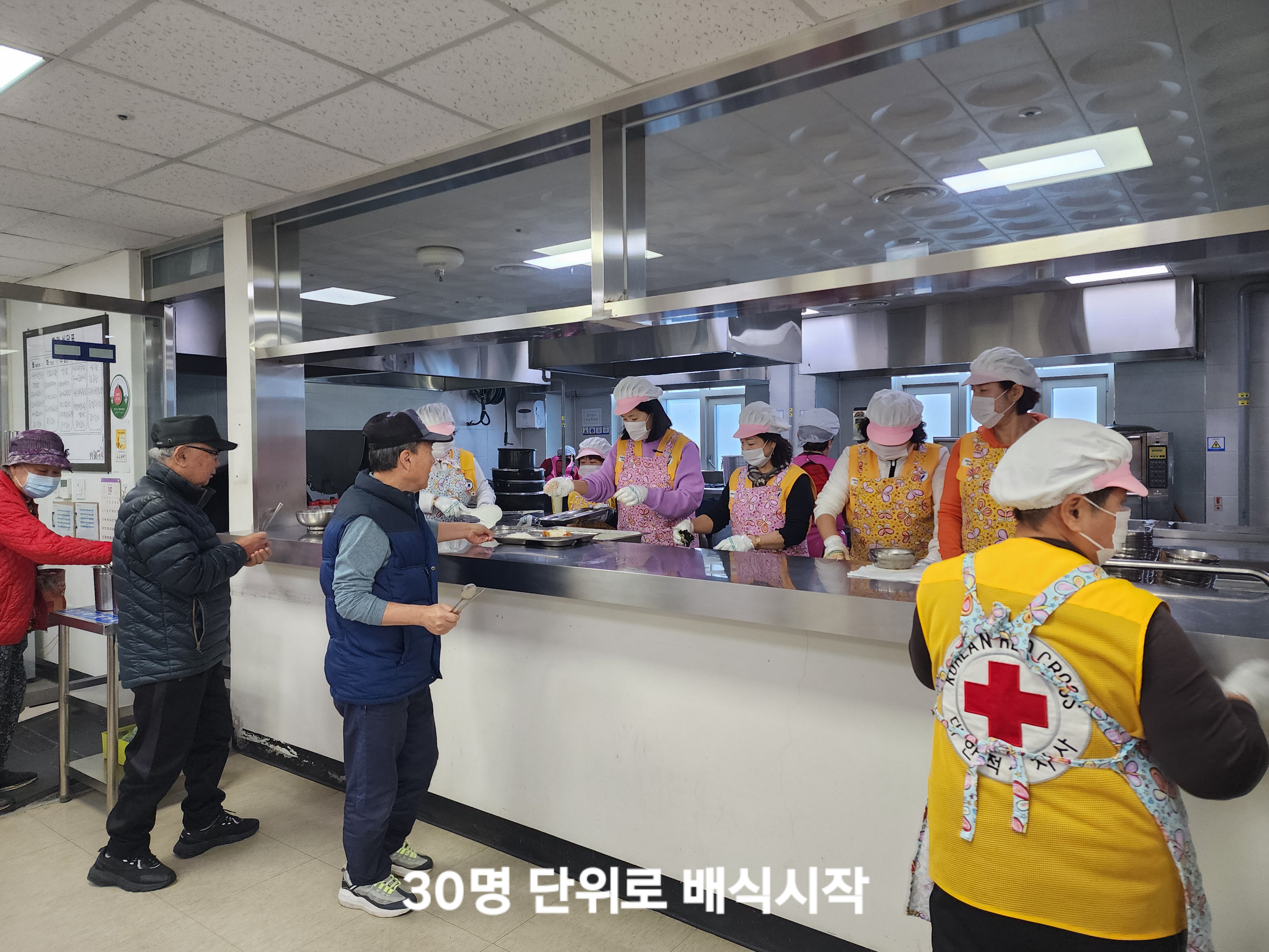 배식이 시작되어 노인들의 안전을 위해 30명 단위로 대기인원을 입장시켜 식당 내부의 안전을 확보하고