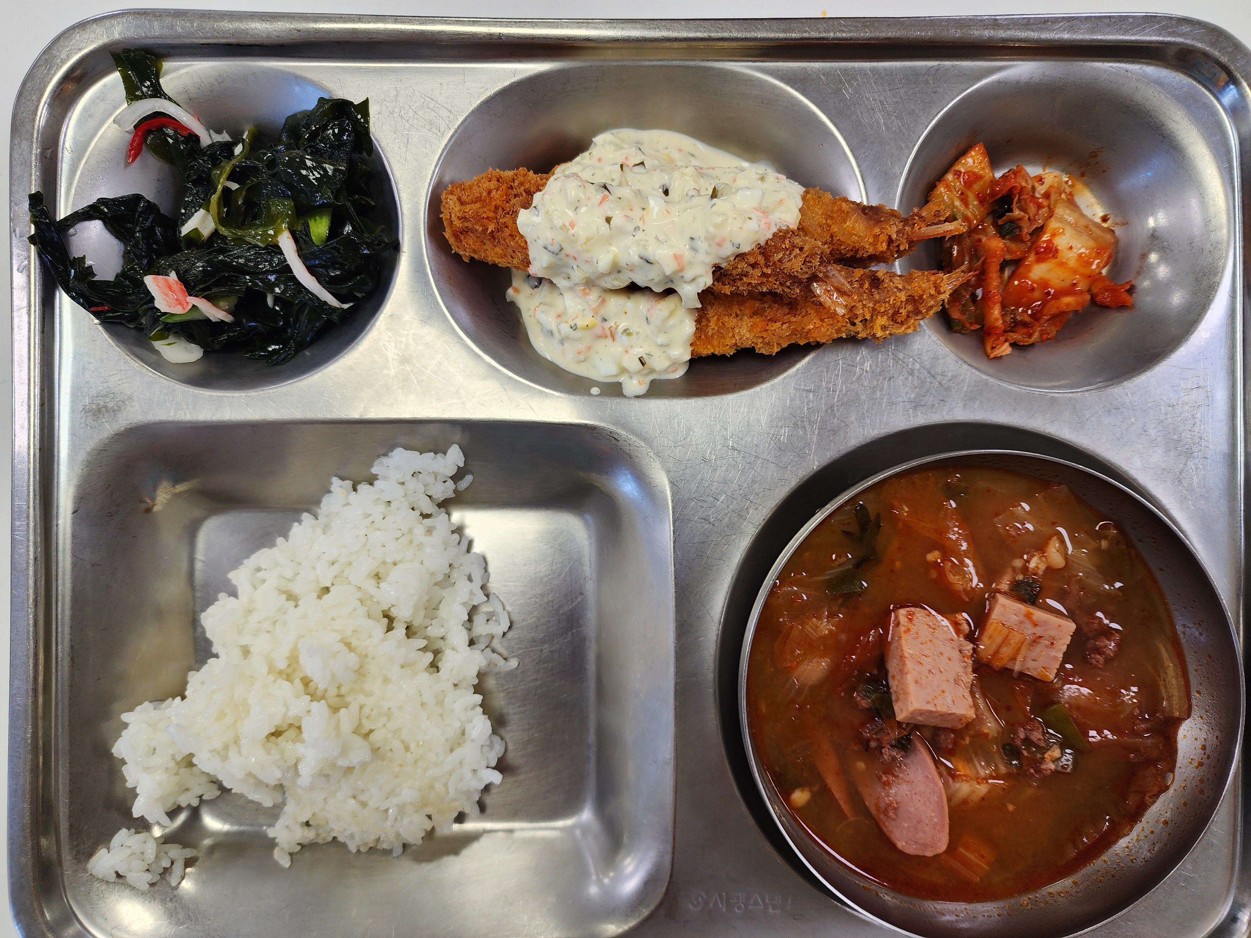 메뉴 : 쌀밥, 부대찌개, 왕새우튀김, 화이트소스, 미역오이무침, 포기김치