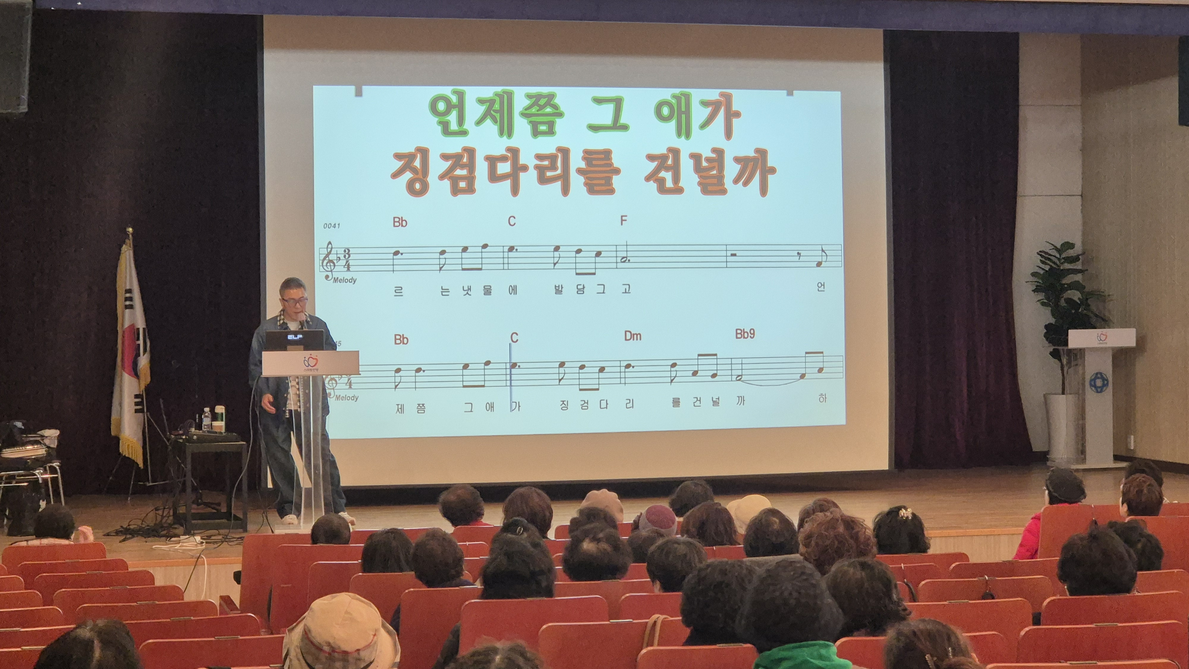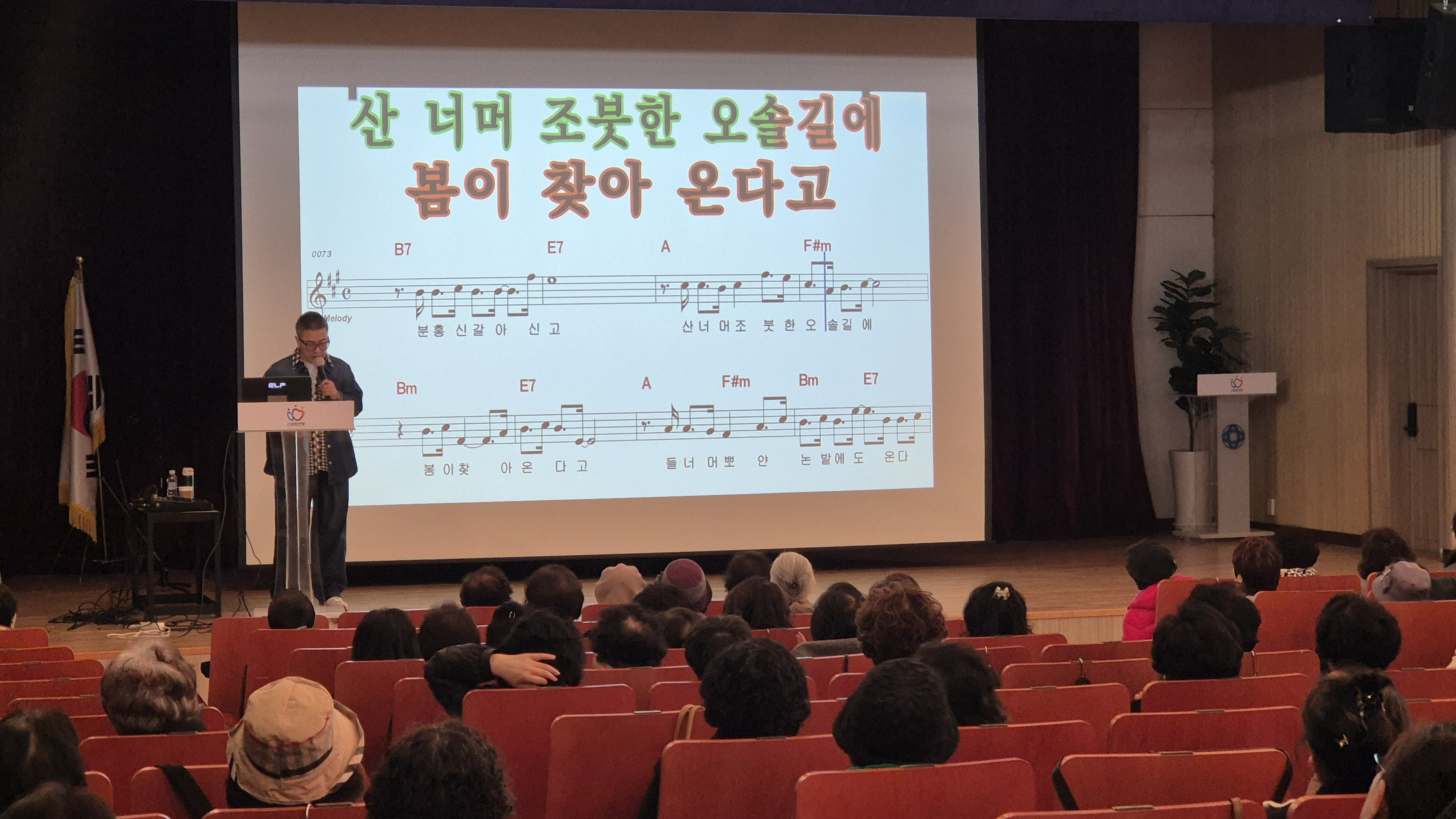 노래교실이 시작되며 선곡이 흘러 나오는데 평상시와 다르게 4박자 노래가 아니고 봄의 노래들이 가곡과 옛 포크송 가수들의 노래가 나오며 허밍을 하며 시니어들과 합을 맞춰 화음을 넣어가며 차분하게 시작한다.