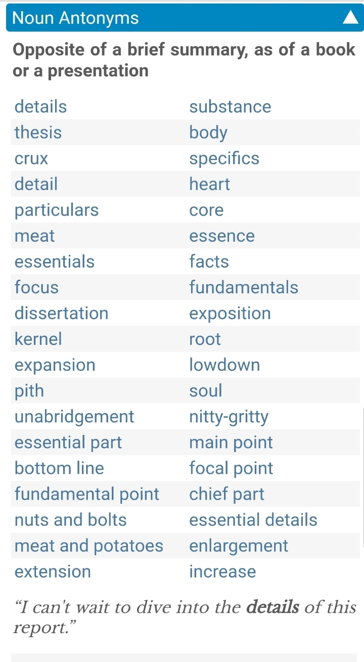 What is the Opposite of a brief summary, as of a book or a presentation