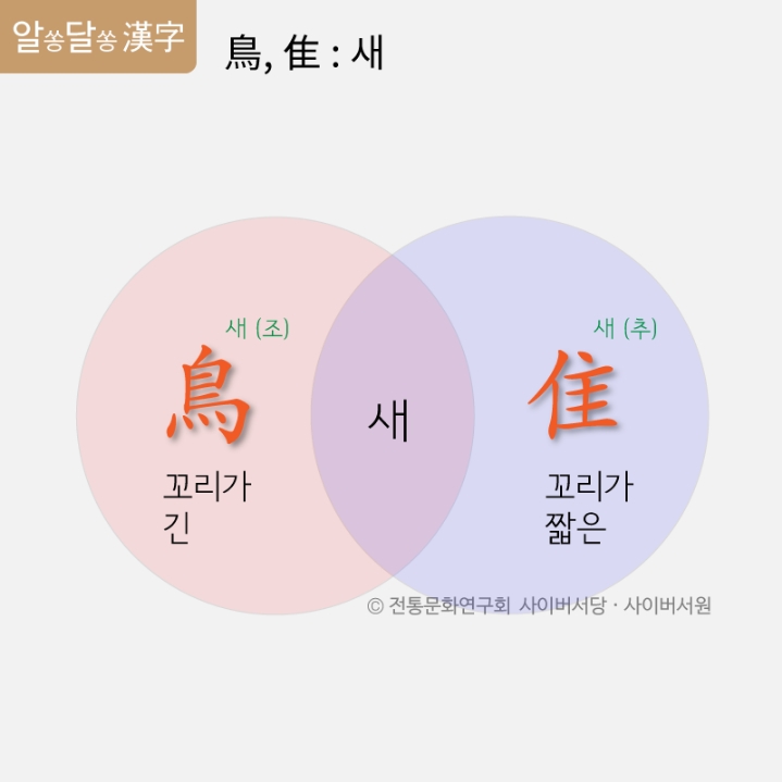 古文에서 鳥(조)와 隹(추)는 동일한 형태와 뜻으로 쓰이던 글자로 小篆(소전)에 와서 오늘날의 자형으로 분화된 것이지 원래는 같은 글자였다. 때문에 《說文解字》에서 구분하고 있는 꼬리의 길이에 따른 구분에는 근거가 없음을 밝혀둔다.