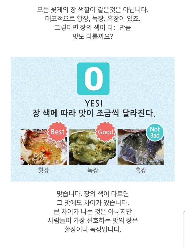 대게의 장은 색에 따라 황장, 녹장, 먹장으로 나뉘는데 황장의 고소한 맛이 가장 강하며 먹장쪽으로 갈수록 쓴맛이 강해진다.
