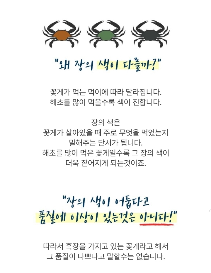당연히 황장이 제일 구하기 어렵고 비싸다. 이 쓴맛 때문에 가끔 먹장을 상한 걸로 취급하는 사람도 있지만 장의 색은 게가 살아있을 때의 먹이에 따라 정해지는 것이므로 절대로 이상한게 아니다.