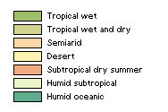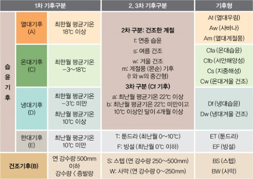 쾨펜의 기후 구분에 따르면 가장 추운 달의 평균 기온이 18℃ 이상인 기후를 열대 기후라 한다. 열대기후는 적도를 중심으로 대개 남북 20도 사이에 나타나며 기온의 연교차는 5~6℃로 매우 작다. 온대와 달리 춘하추동의 계절 구분이 없으며 밤과 낮의 기온차가 연교차보다 크다. 지역에 따라서 우기와 건기의 구분이 나타나고 강수량은 대체로 많아서 연평균 강수량이 2,500㎜를 넘는 곳이 많다. 열대 기후는 강수의 계절적 특성에 따라 연중 강수량이 일정하게 많은 열대 우림 기후(Af), 강수의 편중이 있는 사바나 기후(Aw), 계절풍인 몬순의 영향을 받는 열대 몬순 기후(Am)로 구분된다.
