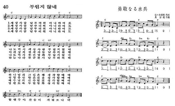 오른쪽은 조선 식민지배의 길을 연 청일전쟁 승리 뒤 일제 해군이 지어 부른 군가 〈용감한 수병〉이고 왼쪽이 그 노래의 곡조를 그대로 옮겨 가사만 바꿔단 복음성가 〈부럽지 않네〉. 각 음절 박자가 달라졌지만 곡(멜로디)은 거의 그대로다.