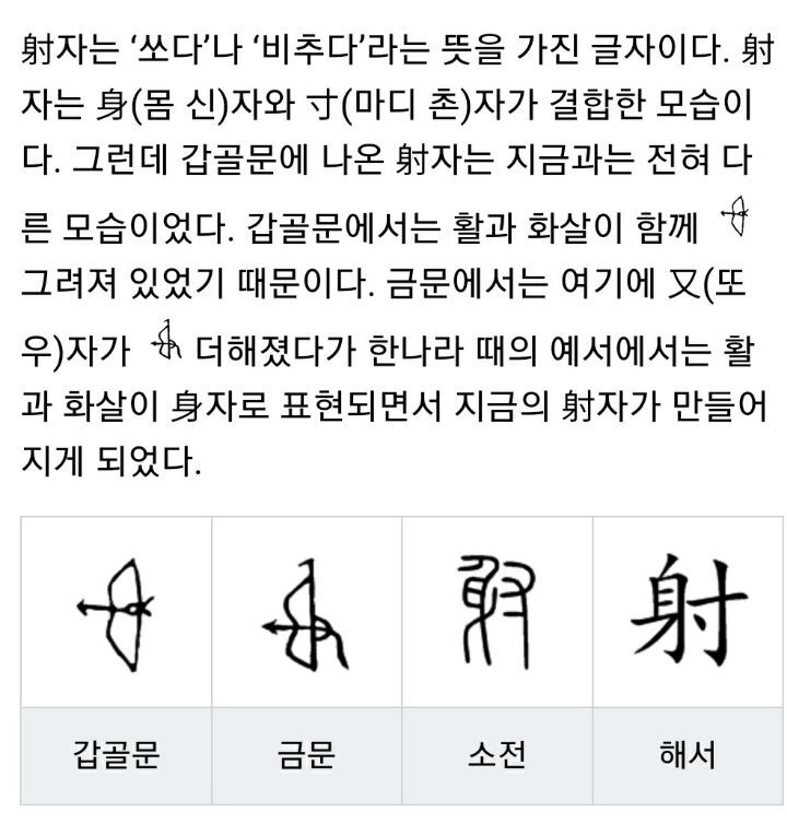 '쏘다 사 射'는 활을 이용해서 화살을 쏘는 모습이 담긴 글자이다