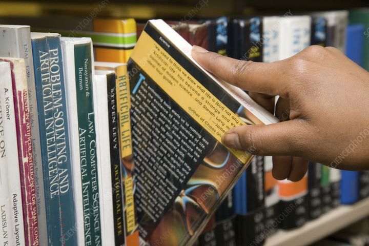 Hand pulling a book off the shelf.