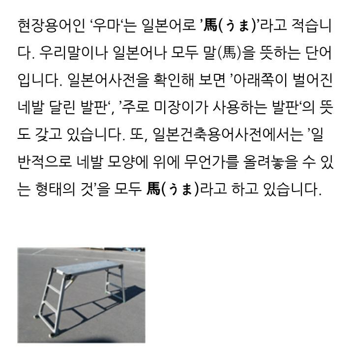 우마 사다리 : 건설공사 현장에서 쓰이는 사다리의 일종. 일본어에서 들어 온 공사 현장 용어