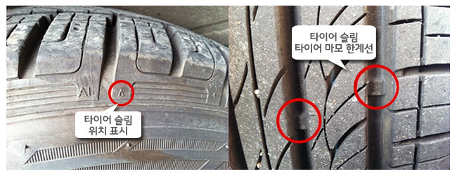 마모가 심한 타이어의 경우 빗길 운전 시 수막현상 발생률이 높아짐은 물론, 마른 노면에서의 주행 시에도 자동차에 있어서 생명과도 같은 타이어지만, 평소 육안으로만 대강 살펴본다면 소홀해지기 쉬운데요, 위 사진의 빨간색 원 안처럼 타이어 마모한계선과 타이어 표면의 높이가 차이가 거의 없다면 빠른 시일 내로 타이어를 교체해 주셔야 해요. 참고로 하얀색 원안의 마모한계선이 정상인 상태랍니다.