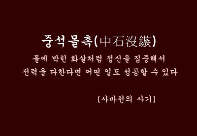 쏜 화살이 돌에 깊이 박혔다는 뜻으로, 정신을 집중해서 전력을 다하 면 어떤 일에도 성공할 수 있음을 이르는 말.