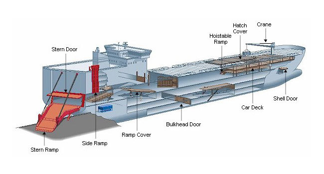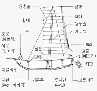 1: 굴뚝; 2: 고물; 3: 프로펠러; 4: 현측; 5: 닻; 6:구상선수; 7: 현두; 8: 갑판; 9: 함교