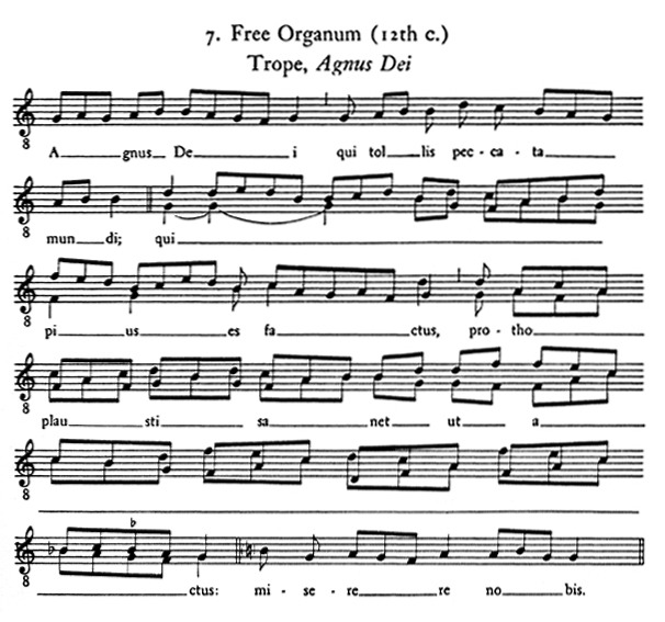 후에 이르러 씨퀀스를 포함한 모든 트로프는 보다 새로운 음악으로 작곡되게 되었다. 여기에 예시한 12세기의 곡에는 트로프가 아뉴스 데이(하나님의 어린양)의 첫부분에 삽입되어 있다. 이것은 2성부 자유 오르가눔의 트로프이다. 리듬 면에서는 평성가와 같이 불규칙적이고 자유스런 흐름을 볼 수 있다.