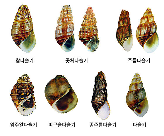 + 체형은 곳체다슬기를 닮았으나 종륵이 발달 / 각피는 흑갈색, 황갈색이고 크기와 종륵의 형태가 다양하다.