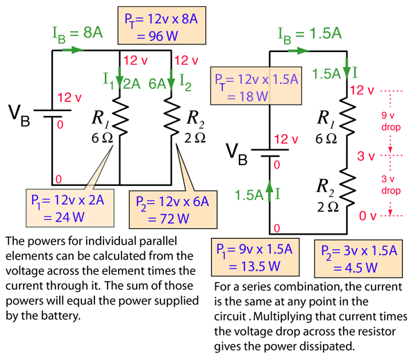 The power relationship is one of the main tools for the analysis of electric circuits, along with Ohm's Law, the voltage law and the current law. Applying the current law to the above circuits along with Ohm's law and the rules for combining resistors gives the numbers shown below. The determining of the voltages and currents associated with a particular circuit along with the power allows you to completely describe the electrical state of a direct current circuit.