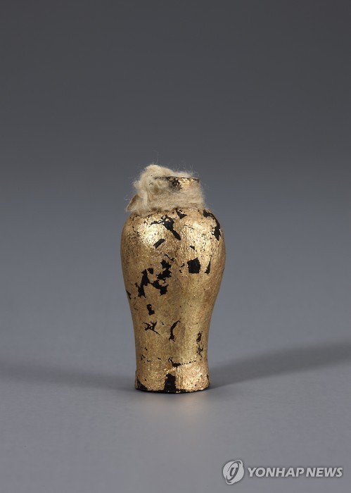 국립중앙박물관. 관음보살좌상의 복장물로 납입된 오보병으로, 중앙을 의미하는 황금색 병이다.
