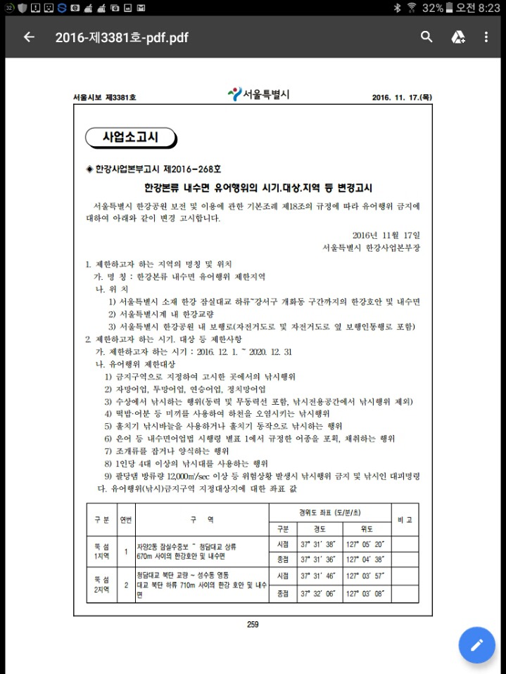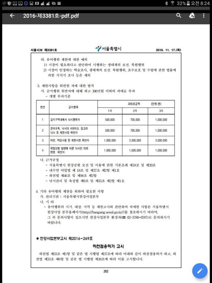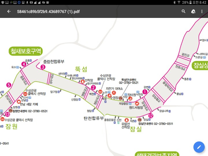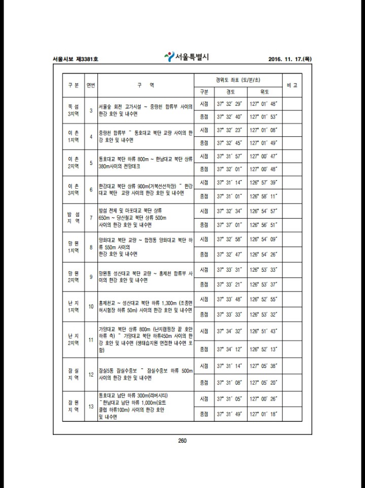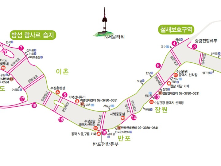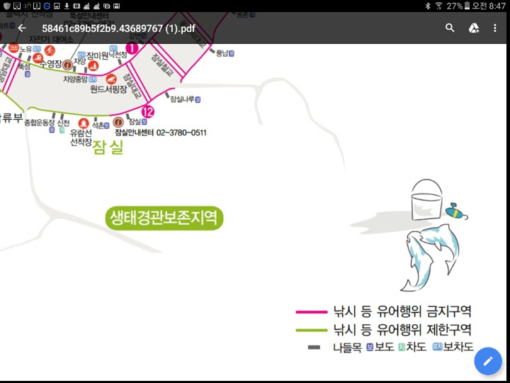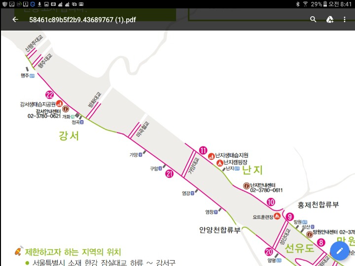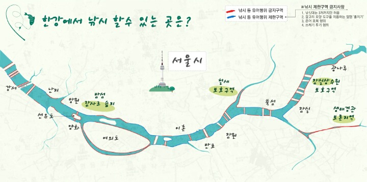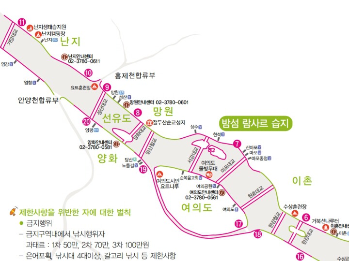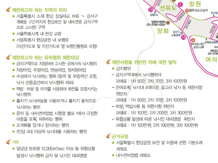 한강의 낚시 금지 구역과 제한적 가능지역 안내도