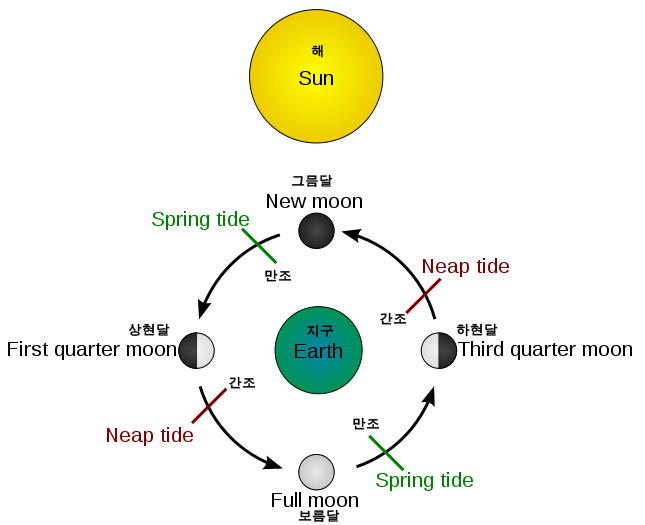 보름달이나 그믐달 때에는 태양과 지구, 달이 같은 선 위에 놓여 태양의 조석력이 달의 조석력에 합쳐진다. 이 시기의 만조를 "한사리"(또는 큰사리, 사리)라 한다. 반달(상현이나 하현) 때에는 태양과 달이 지구를 중심으로 90° 위치에 놓여 서로 조석력이 상쇄된다. 이때를 "조금"(또는 작은 사리)라고 한다.