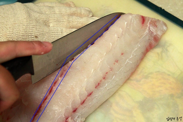 포를 뜬 살 한가운데 "지아이"가 있기 때문에 저렇게 파란색 영역을 분리해줘야 합니다.