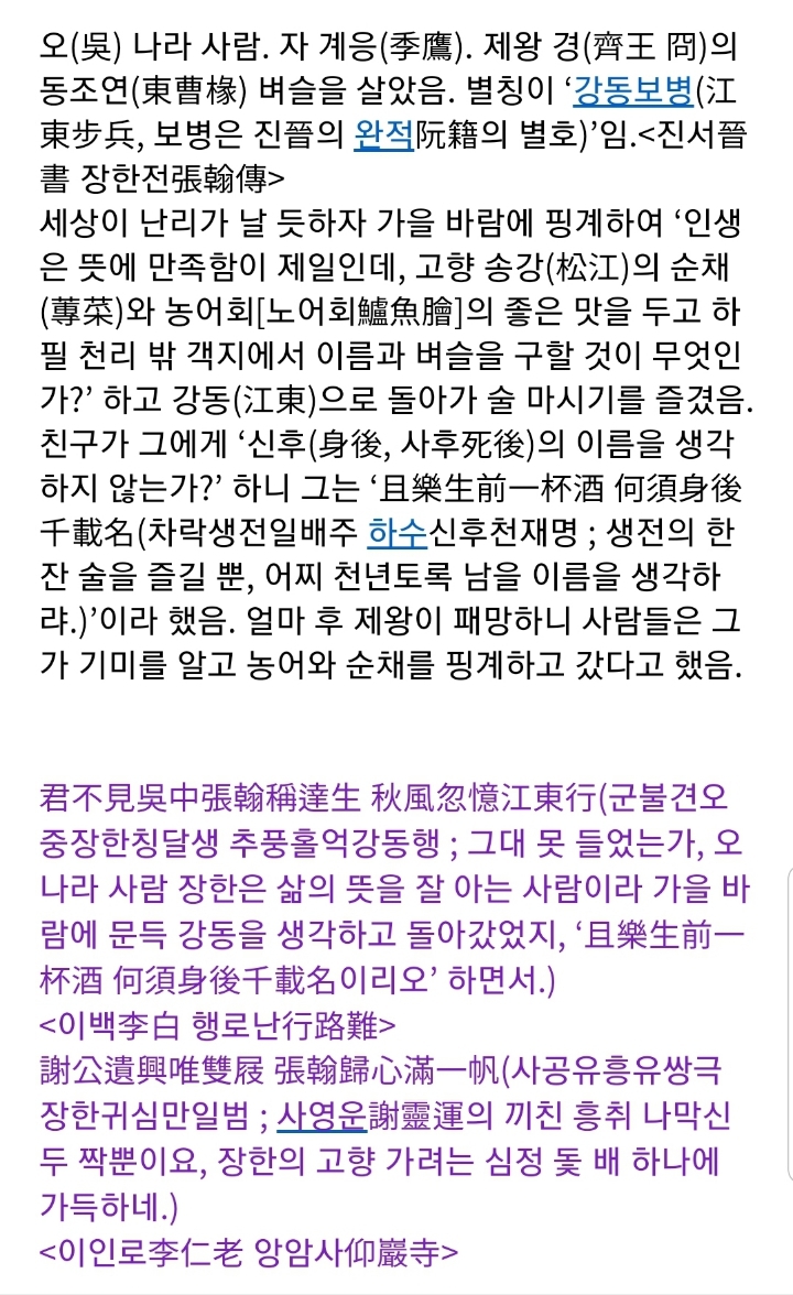 장한[張翰]은 진(晉) 나라 오군(吳郡) 사람으로, 자는 계응(季鷹)인데 문장가이다. 제(齊) 나라에 벼슬하여 동조연(東曹掾)이 되었는데, 가을 바람이 불자