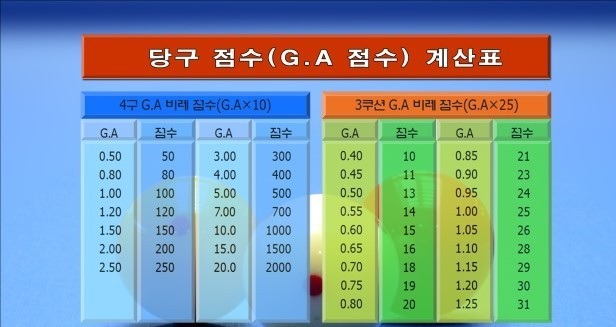 1 대 1 경기로 20인닝으로 총 7게임을 합니다. 그 중 애버리지(C.A.)가 제일 높게 나온 게임과 제일 낮은 애버리지(C.A.)가 나온 게임을 제외하고 나머지 5 게임의 에버리지(G.A.)에 4구는 100을, 3구는 25를 곱한 G.A(Grand Average) 점수 계산표에서 찾은 점수가 자신의 당구 점수가 된다