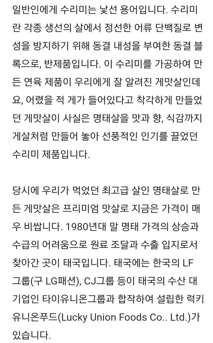 명태살로 만들어진 수리미 제품, 게맛살에는 당연히 게살이 들어 있지 않습니다. 단지 게맛이 나게 만들어졌기 때문에 게맛살이라는 이름을 붙인 것입니다