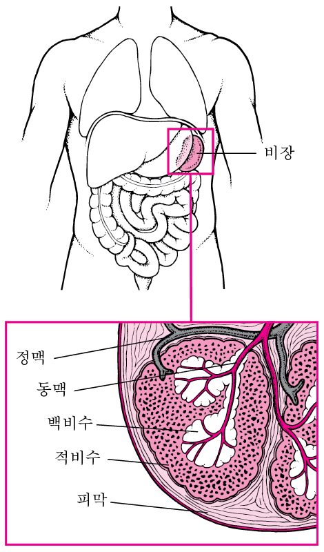 비장(脾臟)은 면역 세포의 기능을 돕거나 세균이나 항체로 둘러싸인 세포들을 혈류로부터 제거하는 작용을 한다.