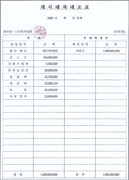 "개시대차대조표"는 회사를 설립하고 사업자등록을 신청하거나 은행이나 정부기관에서 자금을 차입시에 제출하는 주요 서류이니 만큼 신뢰성있게 작성되어야 합니다.