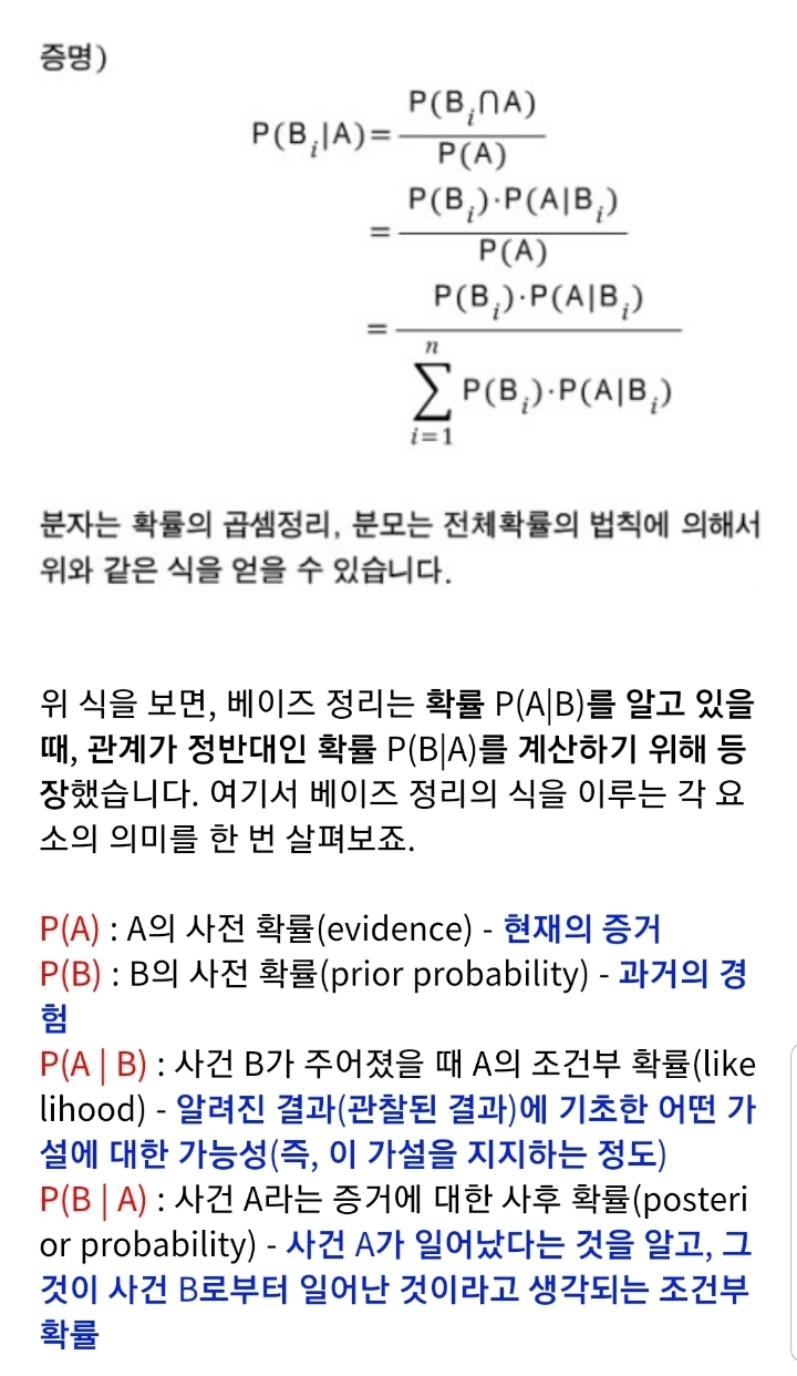 조건부 확률에서는 새로운 정보를 알았을 때 확률의 개선이 일어나게 된다. 가끔 우리는 어떤 실험결과에서 나온 정보를 이용하여 어떤 사건의 처음 확률을 개선시킬 수 있는데, 여기서 처음 확률은 사전확률 (prior probability) 이라 하고, 개선된 확률을 사후확률 (posterior probability) 이라고 하며, 이러한 확률의 개선을 이룩하는 것이 베이즈의 정리 (Bayes' theorem) 이다.