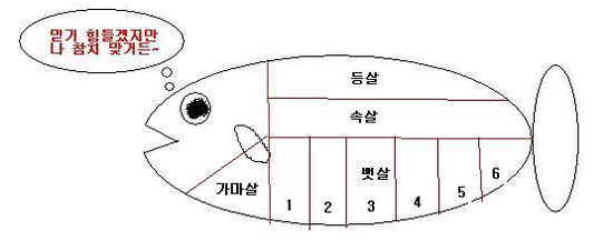 인터넷에 "참치부위"를 치면 여러가지 그림이 뜨는데 제가 한눈에 알아볼 수 있도록 새롭게 그려서 정리해봤습니다.