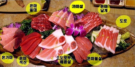 보통 일식집에서 "혼마구로"라 불리는 참다랑어로 블루핀튜나(blue-fin Tuna)라고도 불립니다.