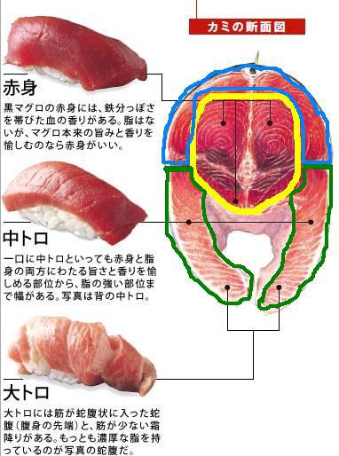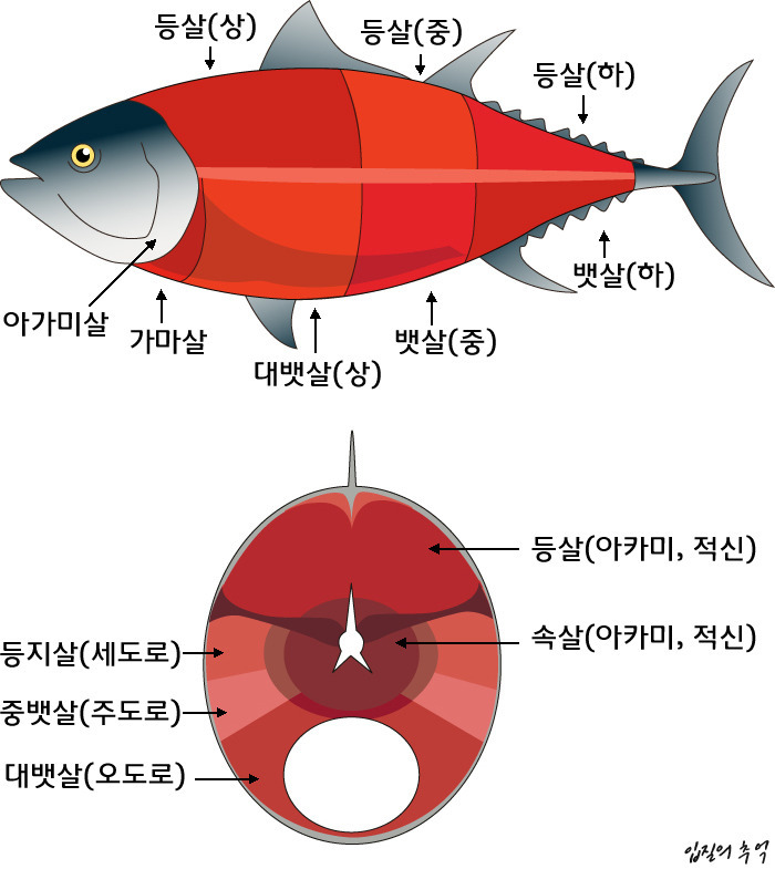 단면도 아랫부분을 보시면 뱃살도 등쪽으로 올라 갈수록 부위가 다르다는걸 알 수 있는데 맛이 가장 진하고 지방이 많은 대뱃살(오도로)은