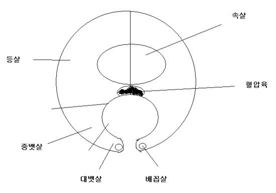 알려져 있습니다. 지금 보시는 대뱃살은 단면도에서 표기한 대뱃살(상)에서 약간 뒷쪽에 위치한 부위로 2~3번 도로에 해당됩니다.