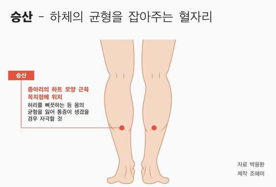 한의학에서 승산(承山)이란 명칭을 지은 이유는 모양과 형태 때문인데 산을 올려다 본다는 뜻으로 발바닥을 곧게 땅에 붙이고 바로 선 사람을 뒤에서 바라보면 종아리 한가운데가 우뚝 솟은 산처럼 보이는데 이곳을 바로 아래 계곡에서 올려다 보고 있는 형국에서 붙여진 이름입니다.