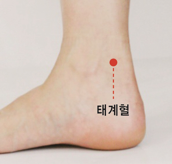 태계혈(太谿穴)은 발목 안쪽에 위치하는 혈자리로, 안쪽 복사뼈와 아킬레스건 사이의 오목한 곳을 지그시 눌러준다. 태계는 큰 계곡이라는 뜻으로, 한의학에서는 노화에 따라 오장육부 개념 중 신장이 허해진다고 보는데, 태계는 신장과 관련된 경맥의 기운이 많이 모여 있는 곳이라고 할 수 있다. 따라서 노인들에게 좋은 혈자리이며, 노화에 따라 나타나는 여러 증상들에 사용하면 좋다. 그중에서도 노인들이 노화로 눈과 귀가 어두워지거나 잠이 오지 않을 때 눌러주면 좋다.