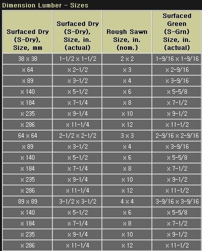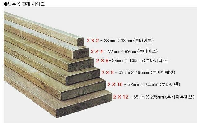 여기서 투바이포 사이즈는 생재를 켠사이즈를 말하고 이후 건조, 면처리 가공을 거치면 러프사이즈 2X4인 목재는 1.5inch x 3.5inch로 가공되는데 이것을 투바이포로 부르는 것이다.