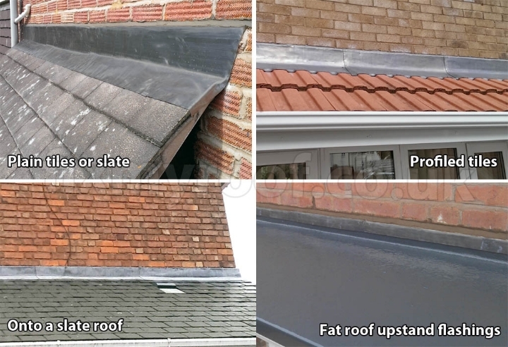 The video below will show you how to fit lead roof flashing like the ones seen in the picture above. When fitting cover flashings to a flat roof like the one pictured bottom right there is no need for the third covering angle of lead, the lead is simply cut just above the flat roof to stop capillary action and the flashing cutting into the flat roof itself.