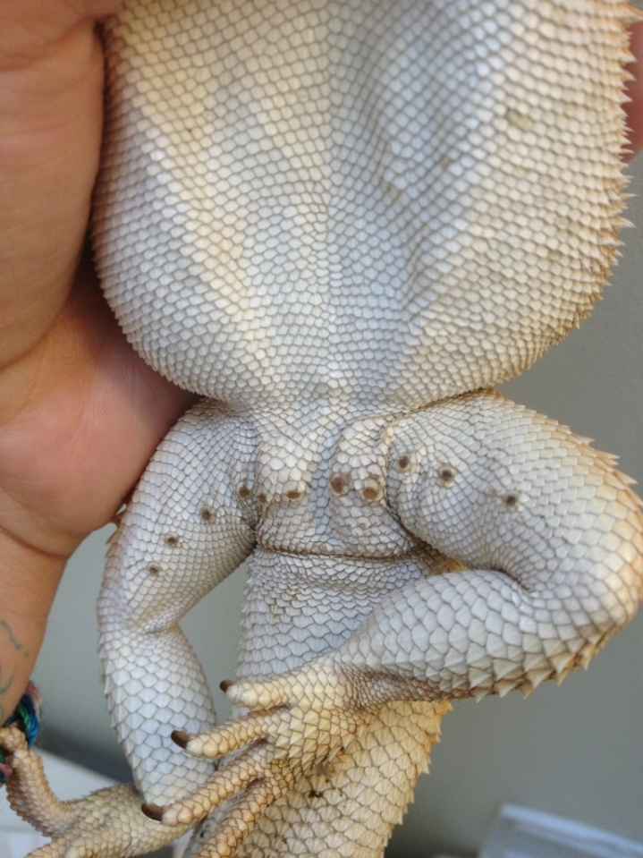 (비어디드래곤의) 대퇴부 작은 구멍들은 뒷다리를 따라가면서 발견되는데 숫놈은 암놈보다 훨씬 크고 뚜렷하다. 사실 암놈은 어떤 경우 알아 차리기조차 어렵다