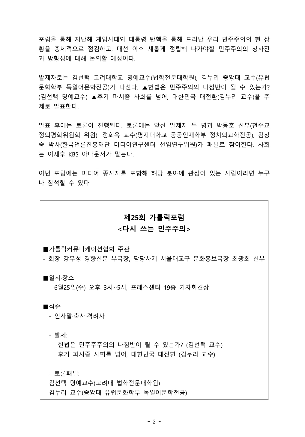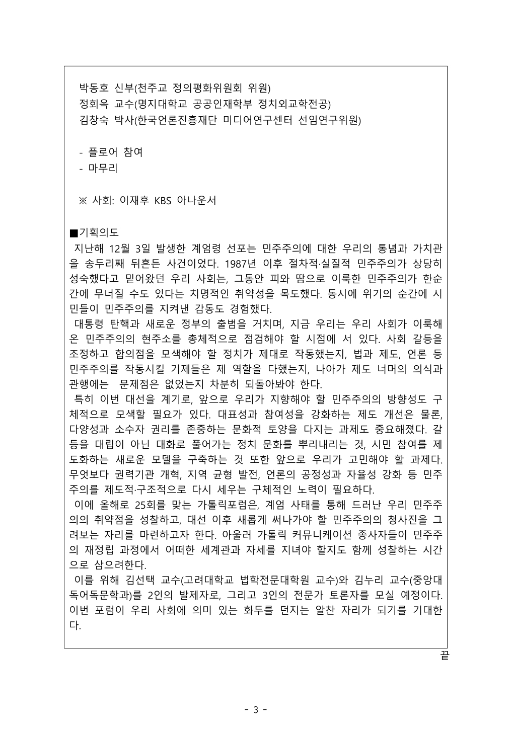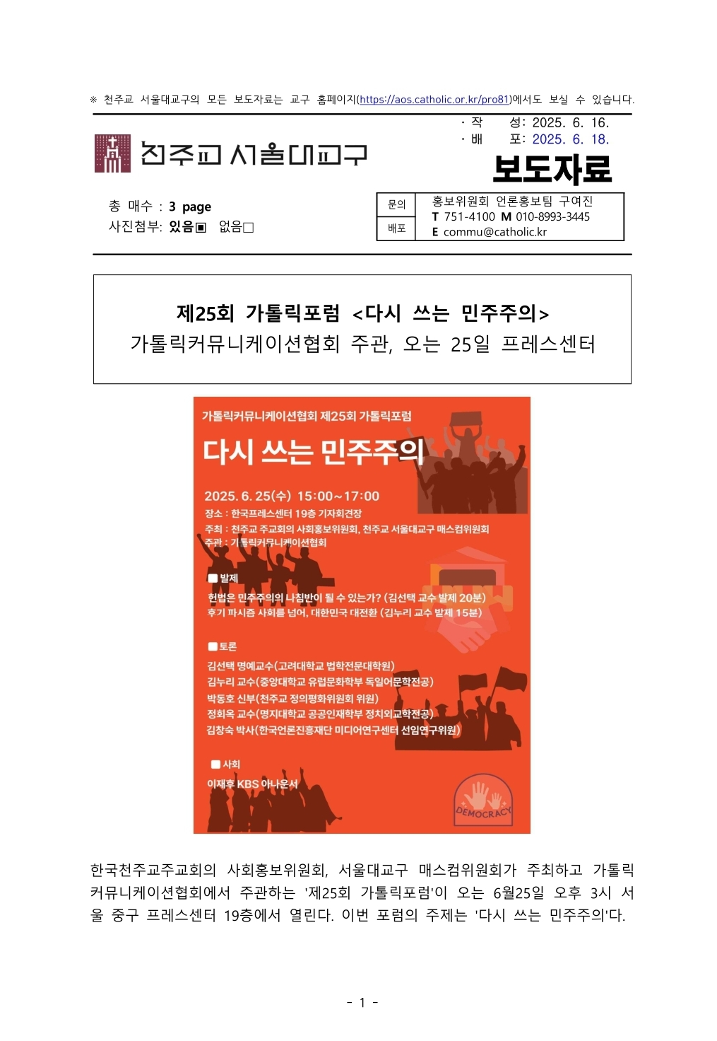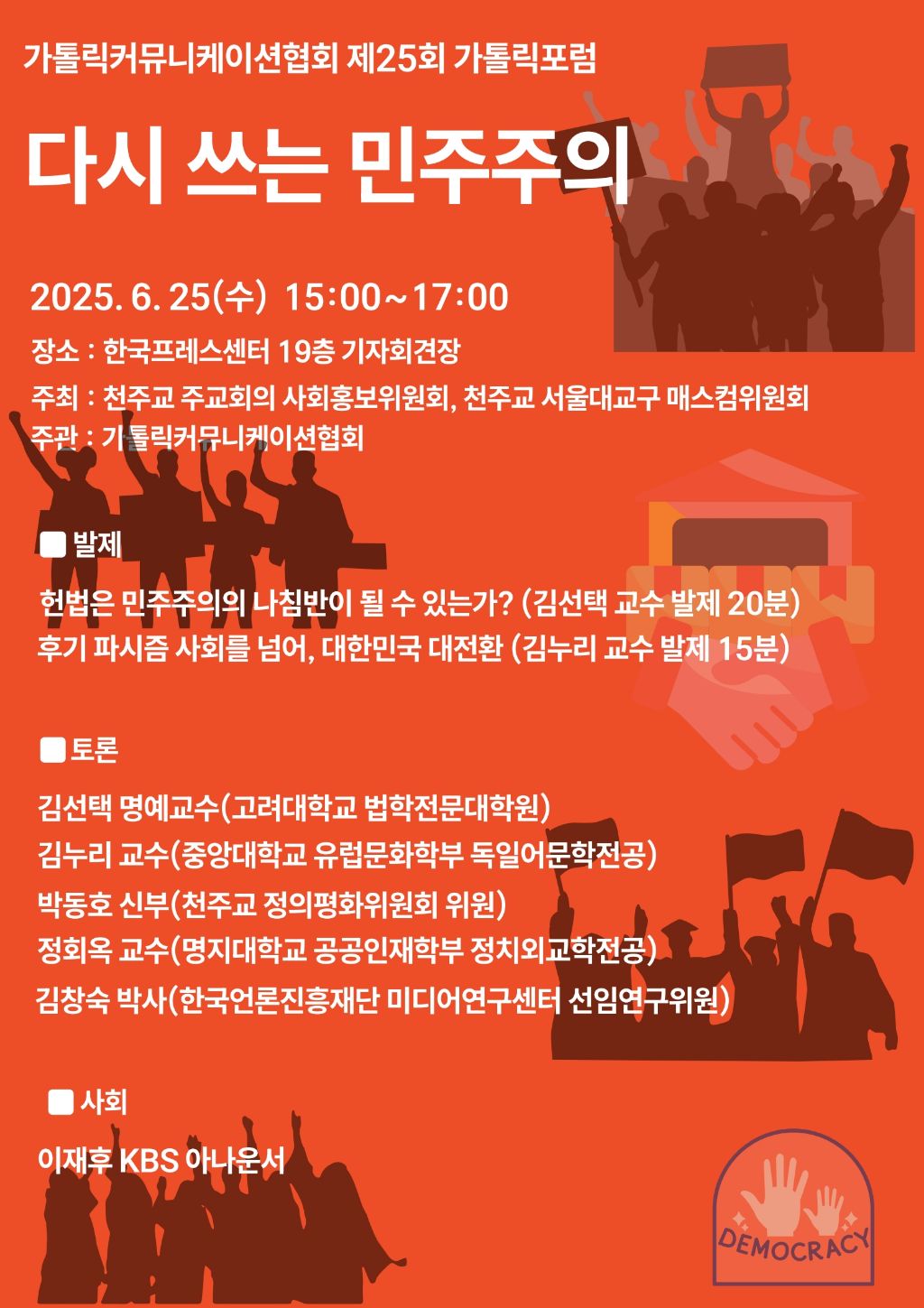 제25회 가톨릭포럼 [다시 쓰는 민주주의] 작성자늘사랑God|작성시간25.06.23|조회수25 목록 댓글 0 글자크기 작게가 글자크기 크게가 상기하자 '625' 15시 프레스센타 19층 다음검색 현재 게시글 추가 기능 열기 북마크 공유하기 신고 센터로 신고 댓글 댓글 0 댓글쓰기 답글쓰기 댓글 리스트