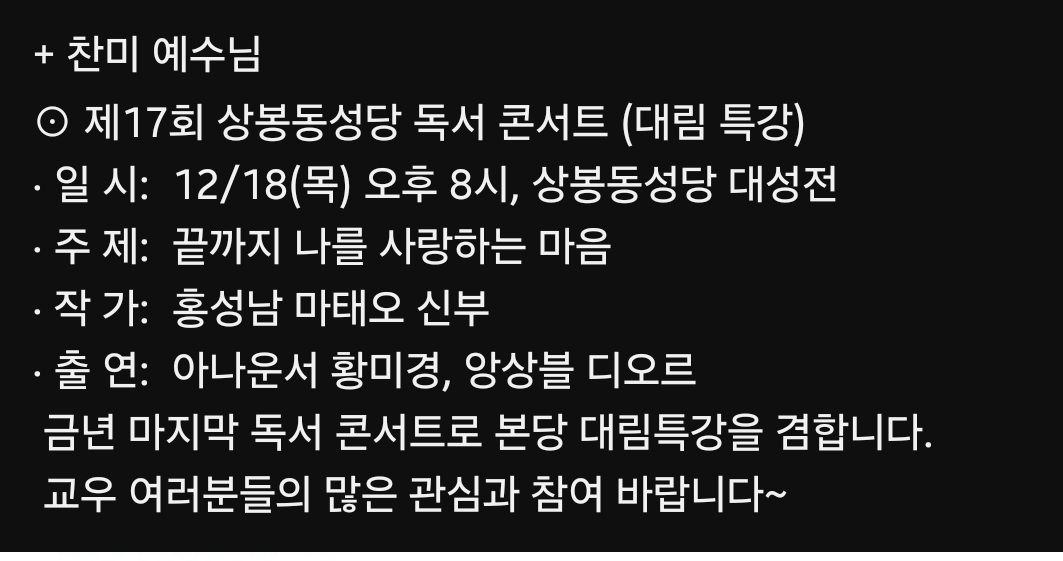 제155회 가톨릭독서콘서트 작성자sk hong|작성시간25.11.28|조회수31 목록 댓글 0 글자크기 작게가 글자크기 크게가 다음검색 현재 게시글 추가 기능 열기 북마크 공유하기 신고 센터로 신고 댓글 댓글 0 댓글쓰기 답글쓰기 댓글 리스트