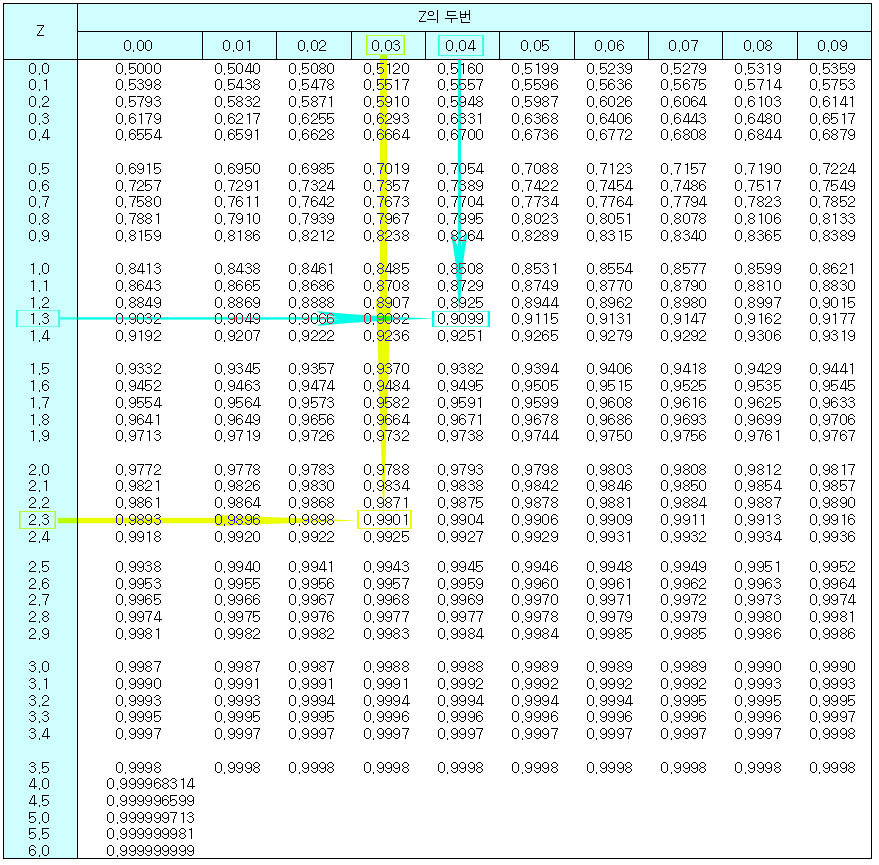 위 식 (2.1),(2.2)에 언급된 상수 1.34 및 2.33 은 표준정규분포표에서 나온것입니다.