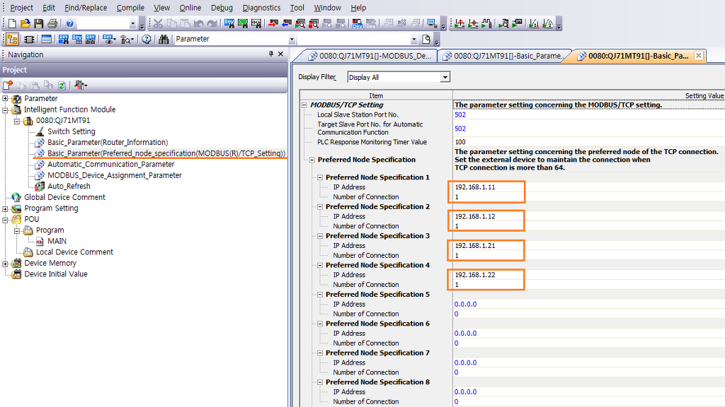 (2) Basic Parameter(Preperred_node_specification(MODBUS(R)TCP_setting) 셋팅입니다