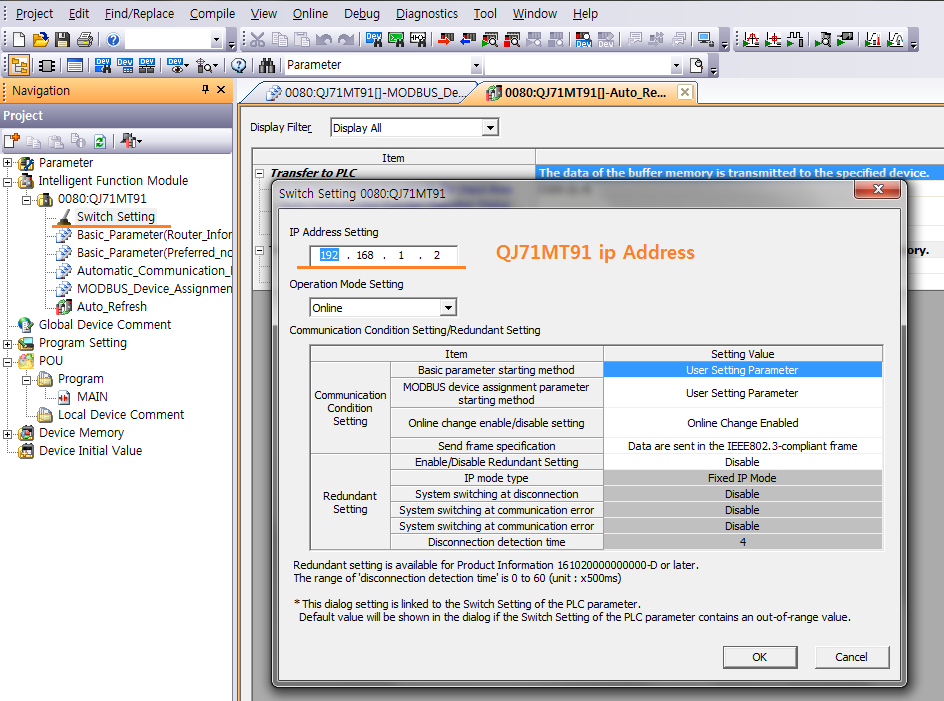 ※ QJ71MT91 모듈의 ip Address를 설정합니다
