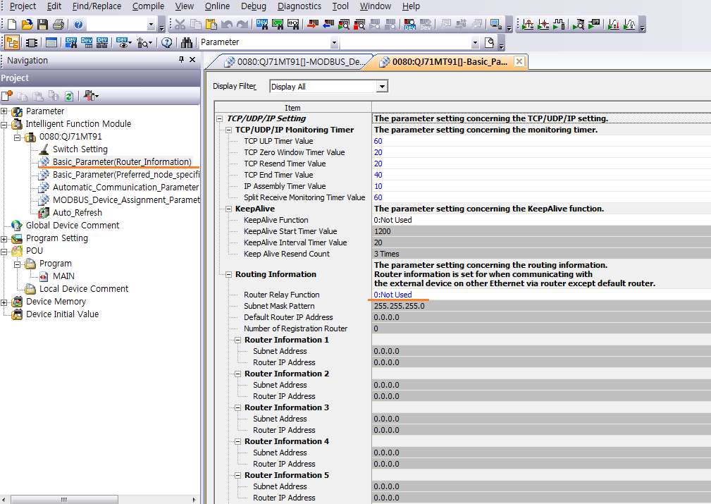 ※ QJ71MT91 모듈을 마스터로 사용할시는 Router Rekay Function을 Not Used로 설정합니다