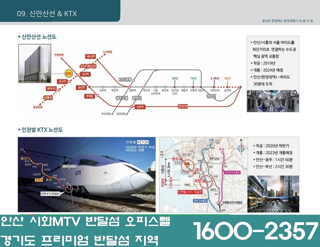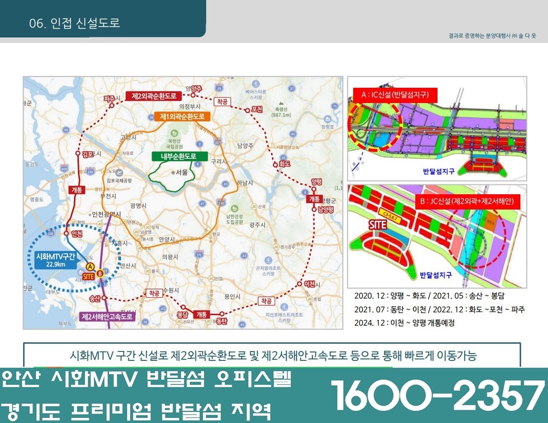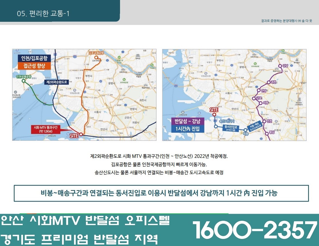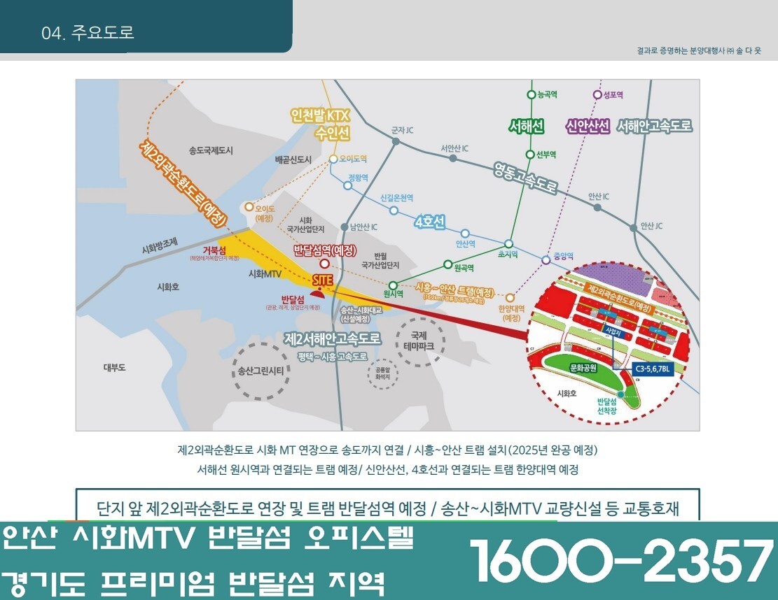- 제2외곽순환도로(2022년 연장예정)으로 송도까지 빠르게 이동가능, 제2서해안고속도로, 영동고속도로, 서해안고속도로, 지하철 4호선, 소사~원시선, 수인선 등과 연계돼 서울 접근성이 더욱 향상