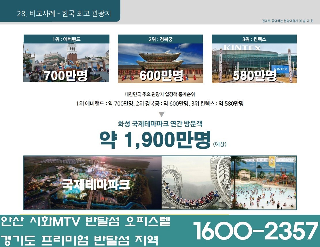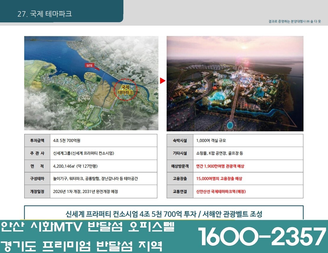 - 에버랜드의 약 6배의 크기로 조성 예정인 국제테마파크는 놀이시설, 쇼핑몰, K팝 공연장, 호텔 등으로 구성되며 연간 약 1,900만여 명의 관광객 유입이 예상되며 약 15,000명의 고용 창출 효과가 기대.