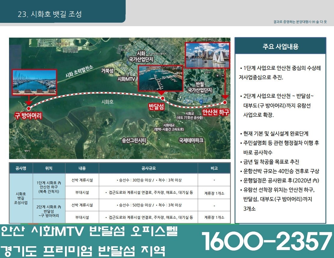 - 안산천 하구를 출발해 반달섬, (구)방아다리로 연결되는 약 21km의 시화호 뱃길을 조성, 서울의 한강 유람선과 함께 시화호에서도 수상 크루즈와 반달섬에 신설 예정인 마리나항을