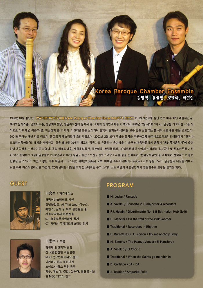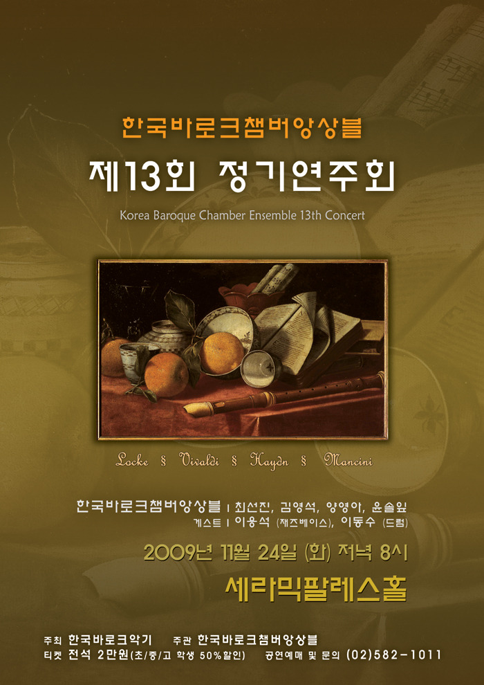 한국바로크챔버앙상블 제13회 정기연주회 [2009/11/24 세라믹팔레스홀] 작성자박광준|작성시간09.11.02|조회수35 목록 댓글 1 글자크기 작게가 글자크기 크게가 - 10인 이상 단체 예매시 20% 할인구입 가능합니다. 단, 학생은 단체할인 적용 안되오니 참고하시기 바랍니다 - 다음검색 현재 게시글 추가 기능 열기 북마크 공유하기 신고 센터로 신고 댓글 댓글 1 댓글쓰기 답글쓰기 댓글 리스트 작성자카을발디 | 작성시간 09.11.03 멋츼다~ 댓글 전체보기