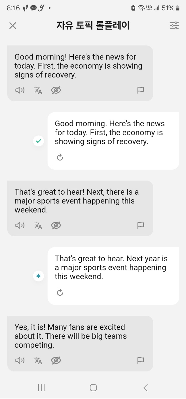 사실 저는 '뉴스 따라 읽기'가 되게 인상 깊었는데요. '뉴스 따라 읽기'는 AI가 오늘의 주요 시사 뉴스를 한 문장씩 읽어주면 내가 똑같이 따라 읽기를 반복하는 거예요.