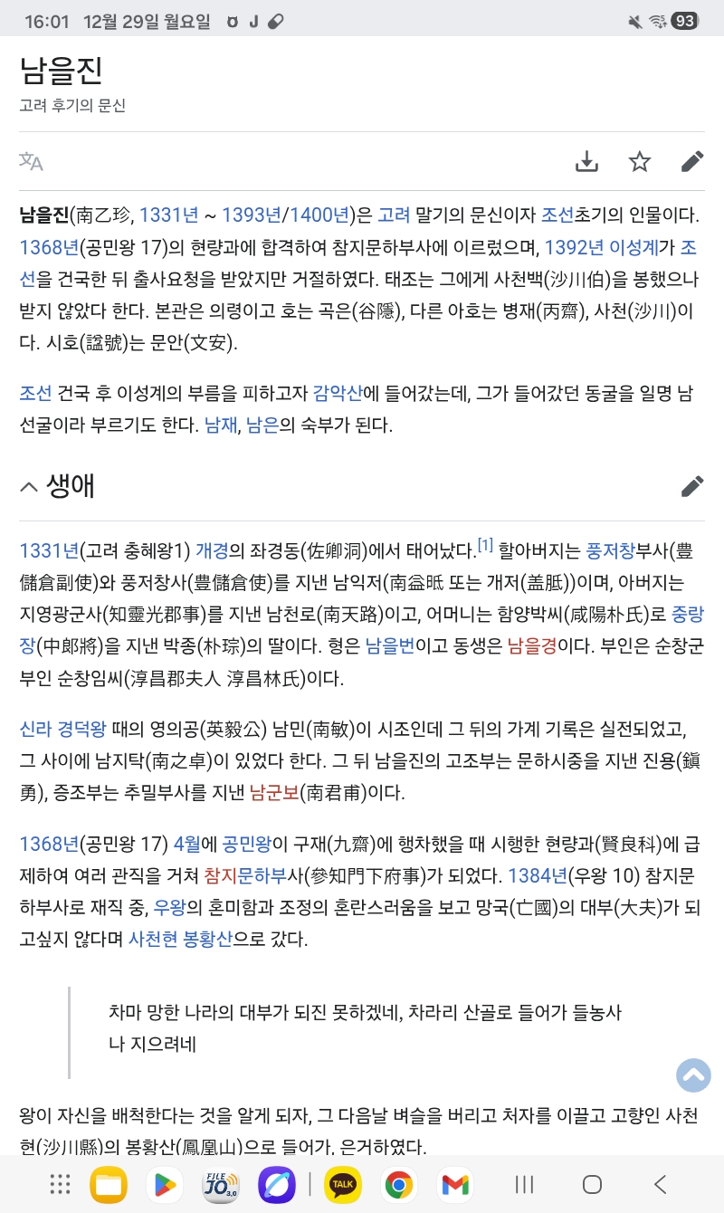 62대 장관 사천백 남을진(영의정 남곤의 선조),고려 최고의 충신