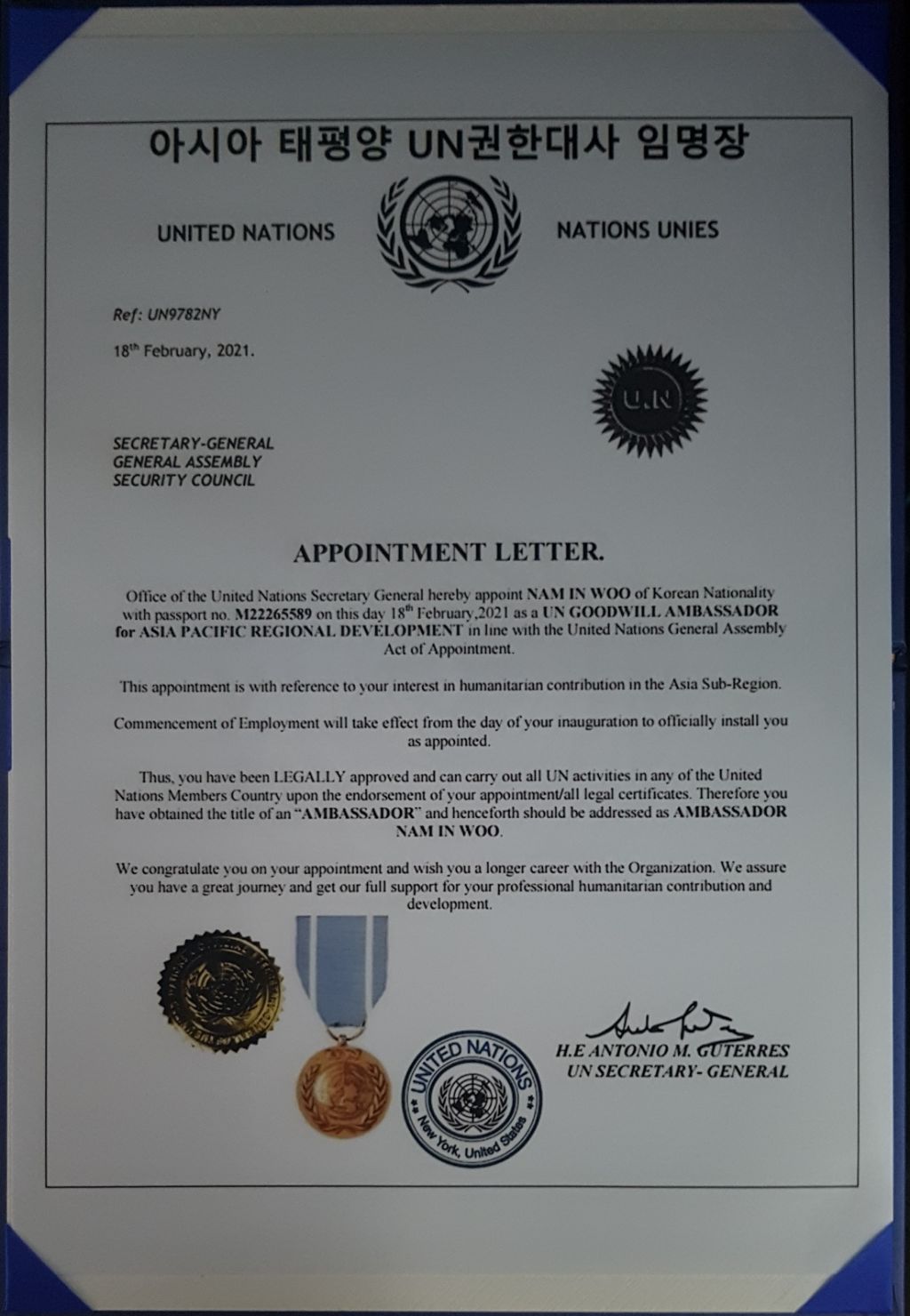 제8전투비행단 국가보훈자 UN국제안보 명예박사, UN대사 남인우